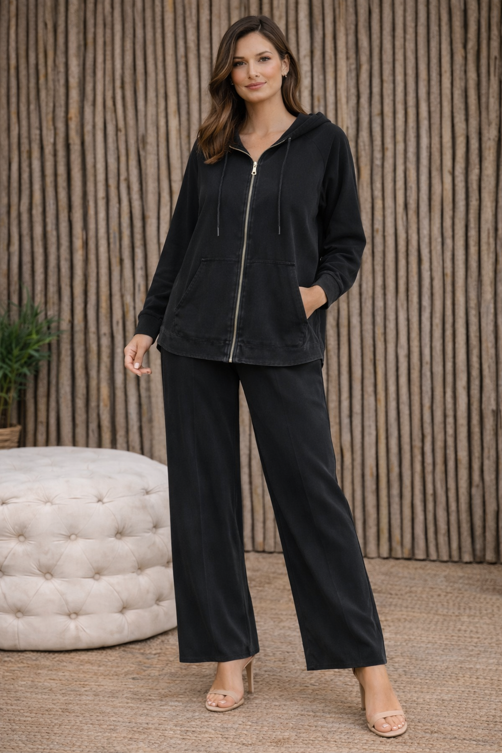 Yumuşak tensel kot kumaşıyla kapüşonlu fermuarlı üst ve rahat pantolon iki parçalı takım. Hafif ve nefes alabilen yapı.