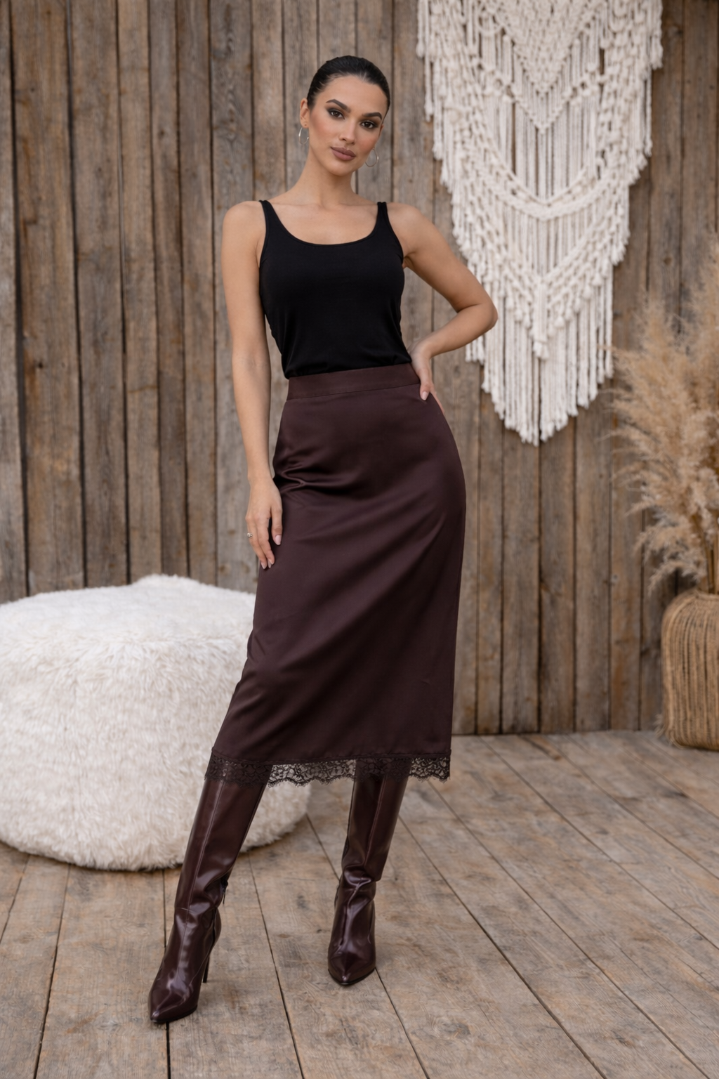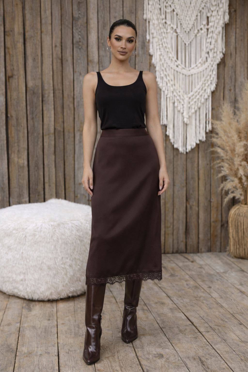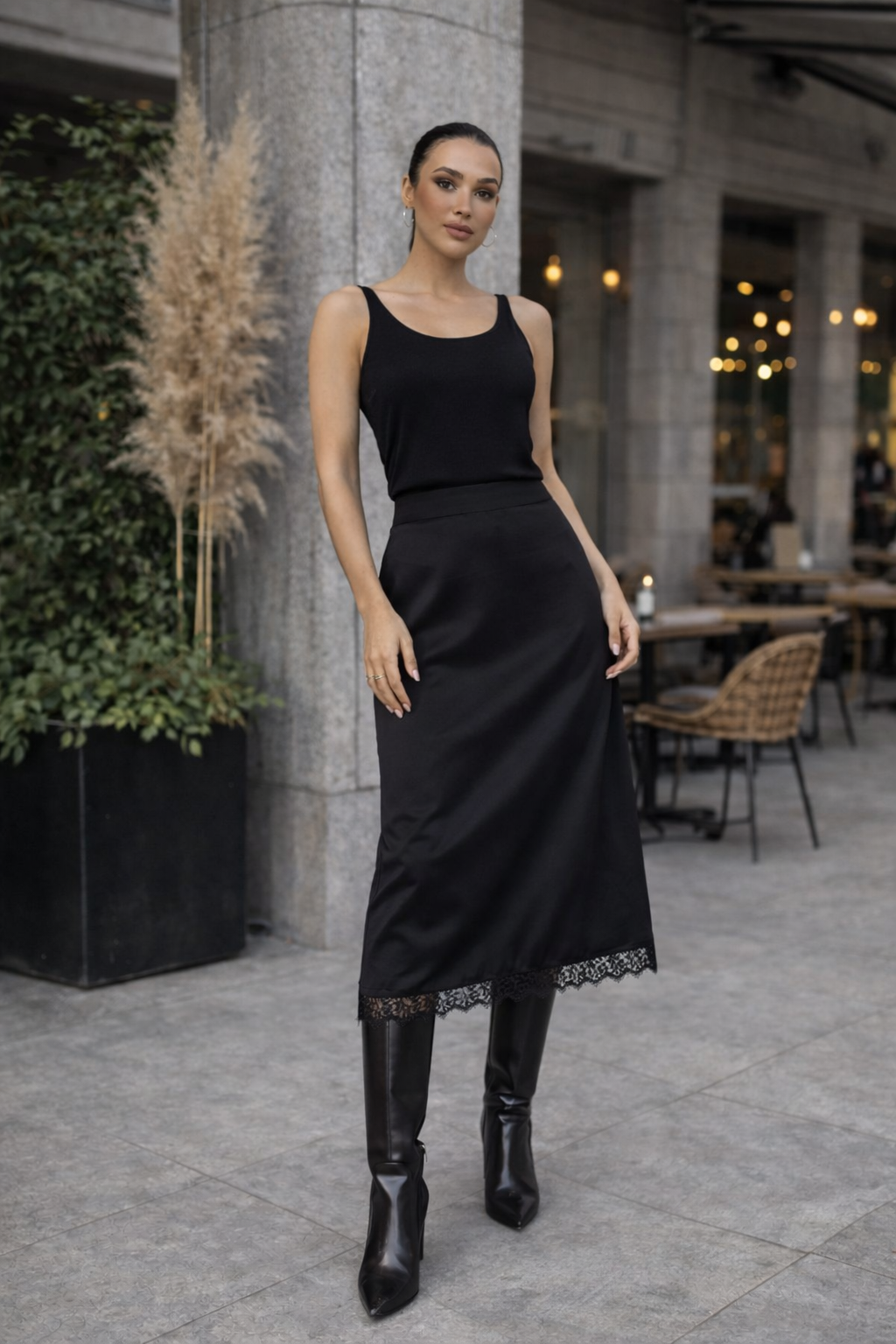 Akıcı saten dokusu ve zarif dantel detayıyla öne çıkan bu midi etek, şık ve feminen bir görünüm sunar. Vücuda uyum sağlayan formu sayesinde zarif bir duruş kazandırırken sade tasarımıyla farklı kombinlere kolayca uyum sağlar. Günlük şık kombinlerden özel davetlere kadar rahatlıkla tercih edilebilecek zamansız bir parçadır.Ürün ÖzellikleriKumaş: Saten