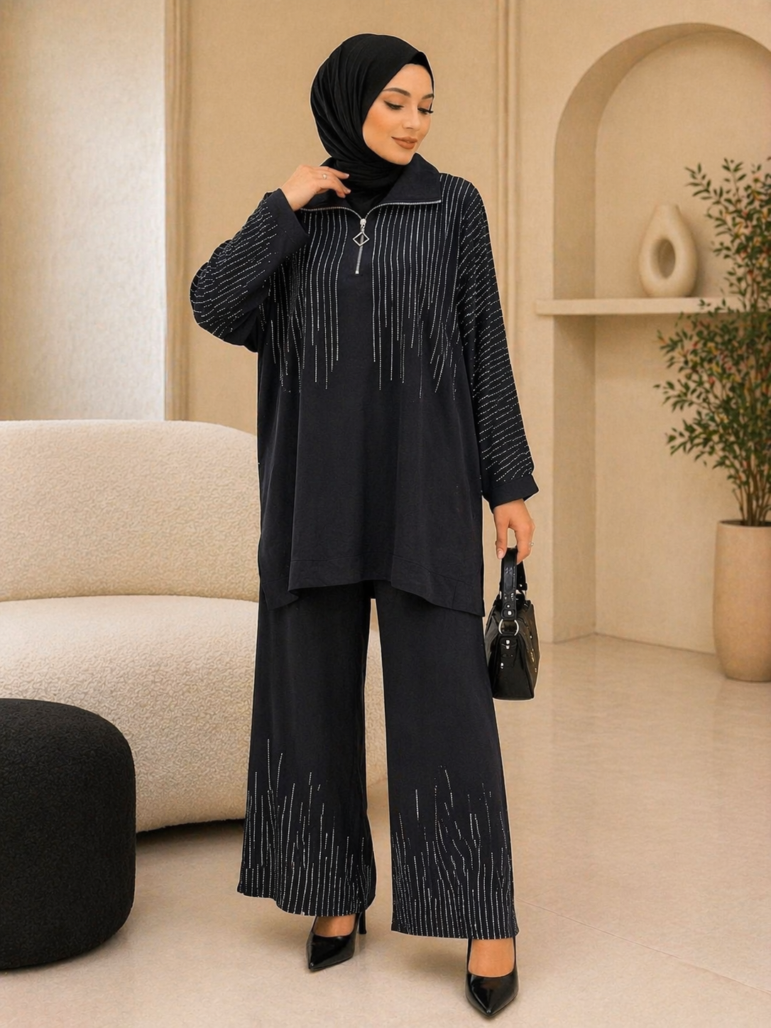 Işıltılı detaylarıyla öne çıkan bu şık takım, özel davetlerden günlük kombinlere kadar geniş bir kullanım alanı sunar. Üst ve pantolonda yer alan ince taş işlemeleri, ürüne zarif bir ışıltı katarken sade tasarımıyla dengeli ve sofistike bir görünüm sağlar.Rahat kesimi sayesinde gün boyu konfor sunan bu takım, hem şık hem de modern bir duruş arayanlar için ideal bir tercihtir. Zamansız tasarımıyla dolabınızın en kurtarıcı parçalarından biri olmaya adaydır.Ürün ÖzellikleriKalıp: Rahat kesim